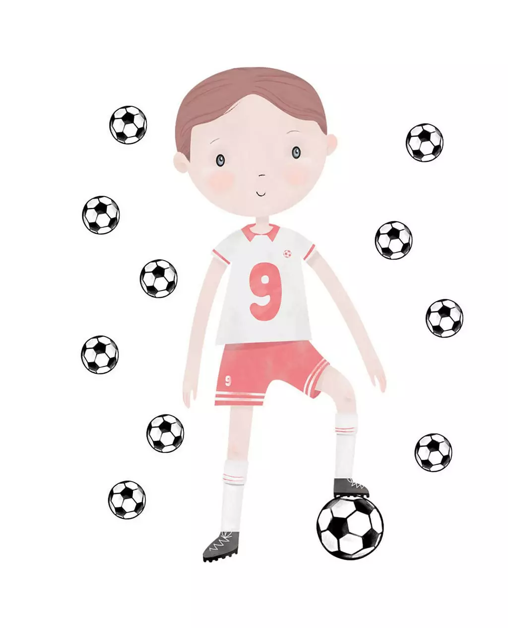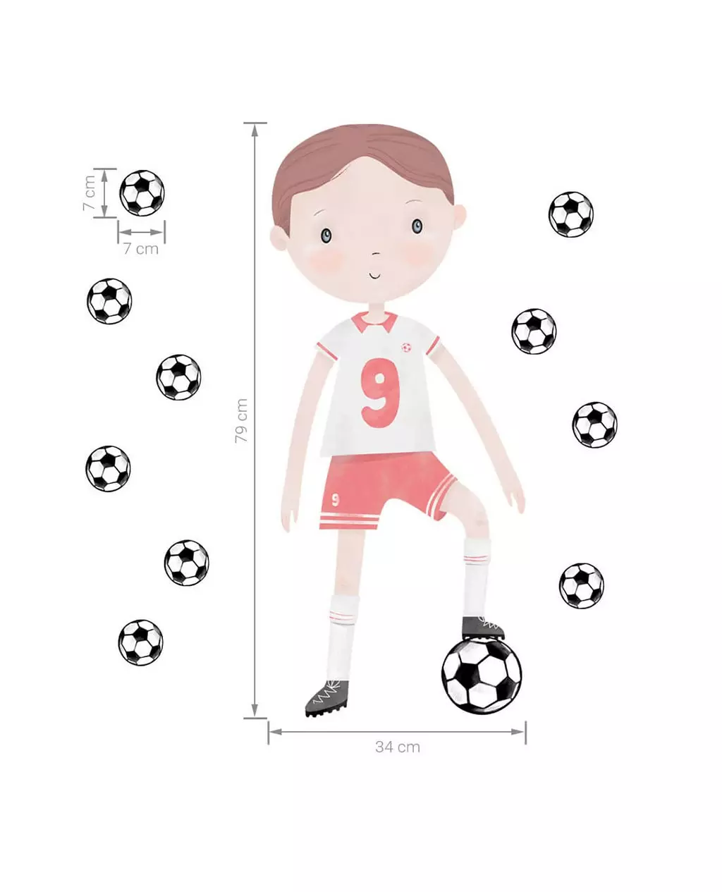 Deze muursticker voetballer in rood tenue is perfect voor kinderen die van voetbal houden. De set bestaat uit één grote sticker van een cartoon-voetballer met rugnummer 9 en tien losse voetballen, waarmee je zelf een speelse compositie kunt maken op de muur. Formaat: circa 85 x 60 cm.