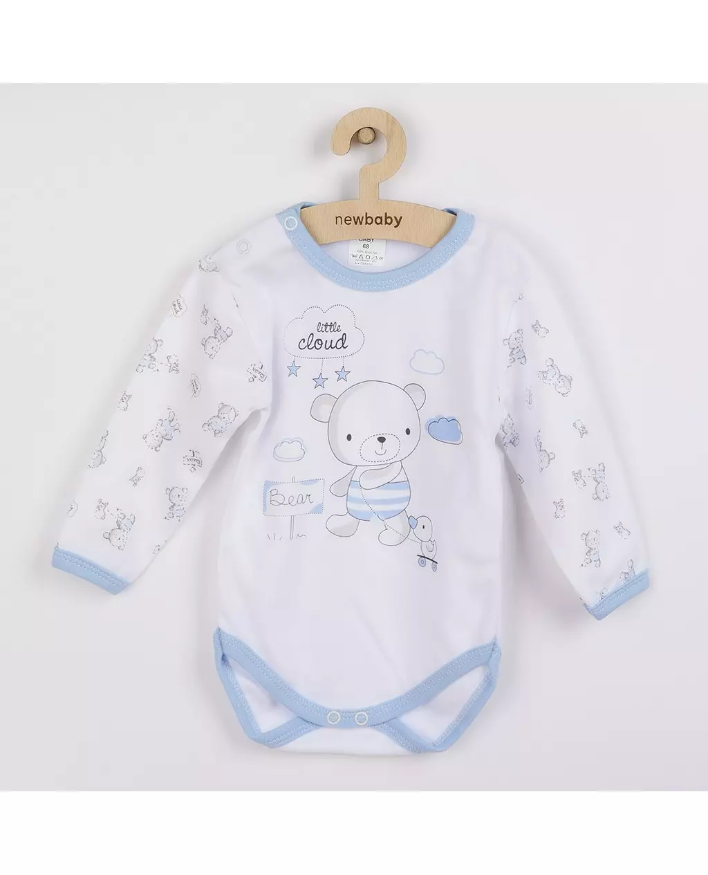 De Babybody New Baby Bears in maat 50 is perfect voor jouw nieuwe baby. Deze blauwe baby romper met lange mouwen is versierd met schattige teddybeerprints op de mouwen. Op de voorkant prijkt een grote afbeelding van een teddybeer met de tekst "little cloud", wat deze outfit een betoverende uitstraling geeft. De zachte blauwe bies aan de randen van de mouwen en de onderkant voegt een speels accent toe, waardoor deze romper zowel stijlvol als comfortabel is.