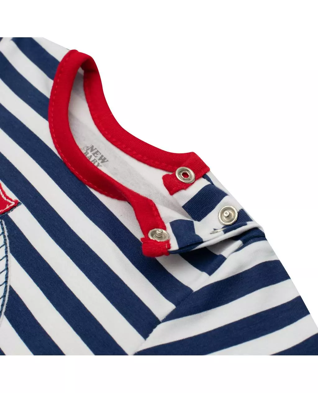 Het T-shirt heeft een ronde hals en korte mouwen en is ontworpen met een levendige kleuraccent rond de nek. De moderne strepen geven het shirt een speelse uitstraling, terwijl de schattige boot applicatie met anti-scratch afwerking ervoor zorgt dat het comfortabel is voor je baby. Dankzij het handige schouderbandje is het aankleden eenvoudig en snel.