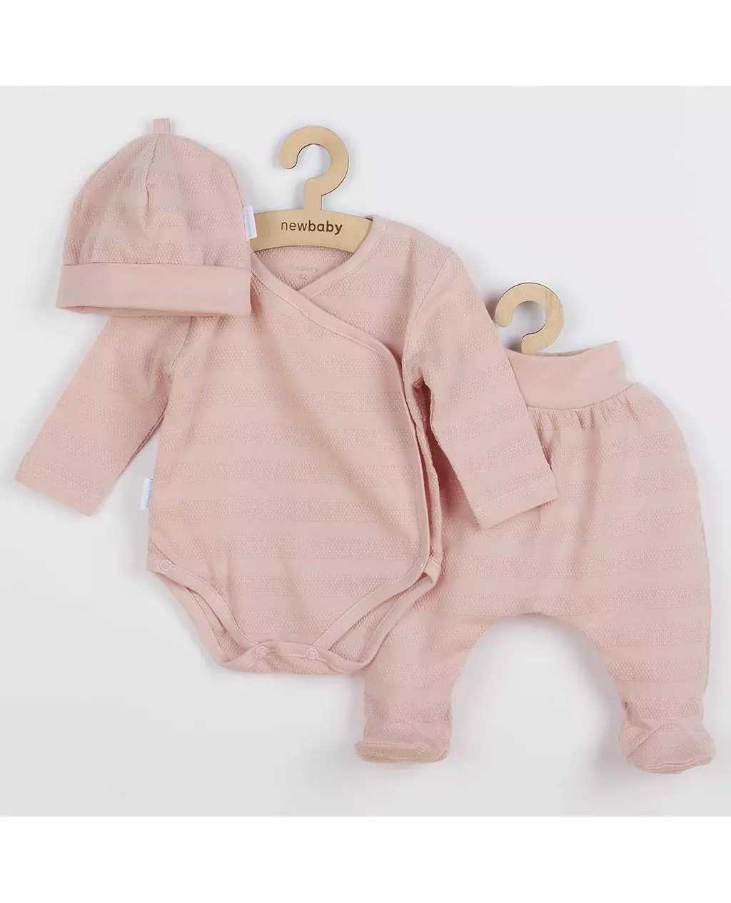 Ontdek de schattige en praktische 3-delige babyset in een zachte roze kleur, speciaal ontworpen voor pasgeborenen. Deze set bevat een comfortabele romper, een broek met voetjes en een muts, allemaal gemaakt van 100% katoen voor de ultieme zachtheid en ademend vermogen. De romper heeft lange mouwen en een slimme zijknopsluiting, terwijl de broek een brede elastische tailleband heeft die niet drukt op de gevoelige buik van je baby.