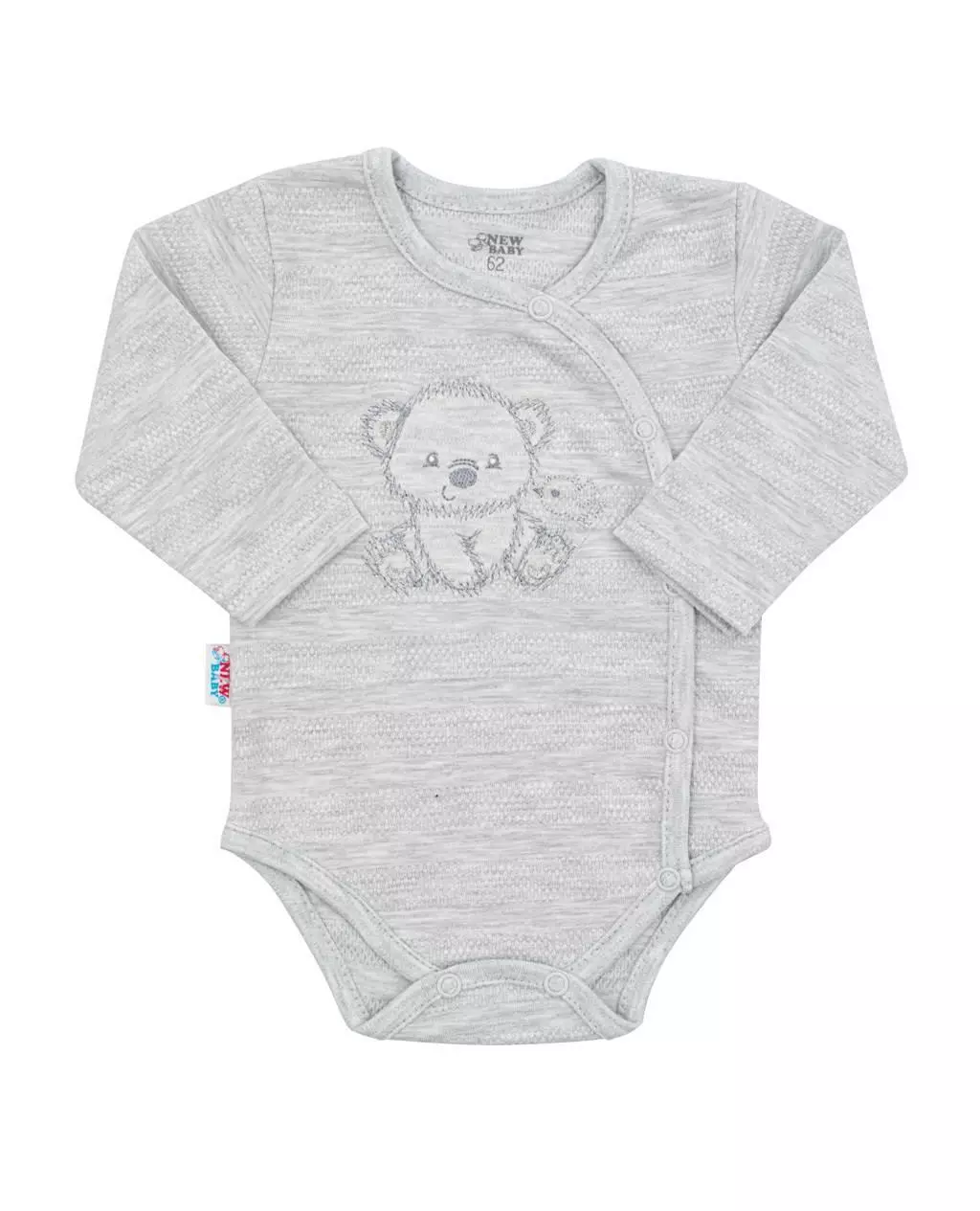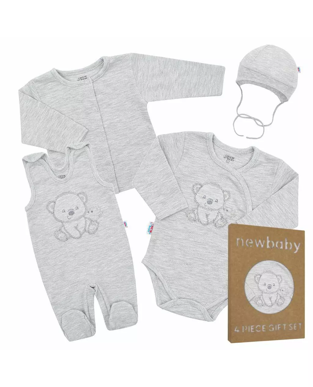Ontdek de schattige New Baby Babyset bestaande uit een grijs jasje, romper met lange mouwen, boxpakje en mutsje, allemaal vervaardigd uit 100% katoen. Deze vierdelige set is niet alleen perfect voor de kraamafdeling, maar ook ideaal voor dagelijks gebruik. Het heeft een schattig ontwerp met geborduurde afbeeldingen van een teddybeer en een vogel, wat zorgt voor een lief en origineel geheel.