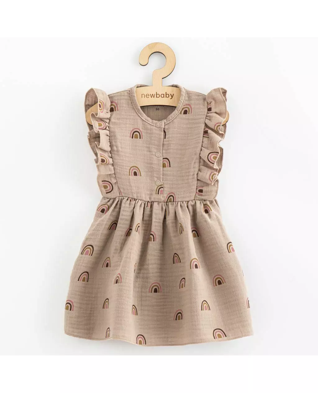 Ontdek de New Baby kinderjurk in muslin stof, beige met vrolijke regenbogen, maat 74 (6-9 maanden). Deze mouwloze zomerjurk is perfect voor kleine meisjes. Gemaakt van 100% katoen, biedt het lichte en ademende comfort voor elke zomerdag.
