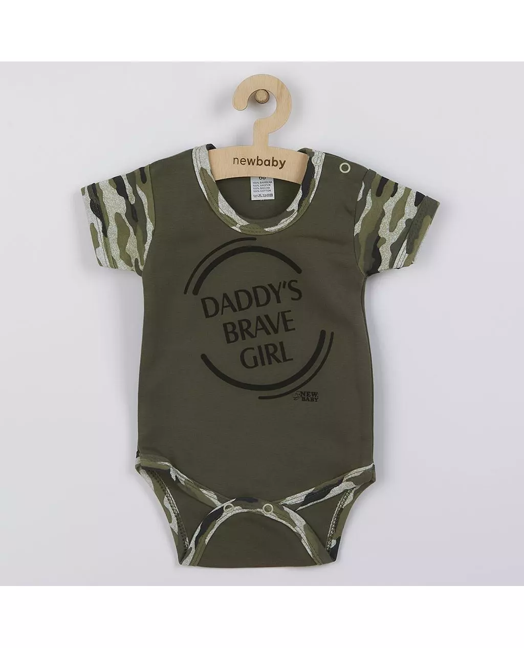 Laat je kleine dappere meisje stralen in deze schattige en stijlvolle babyromper van het Tsjechische merk New Baby Army. Deze kortom sweatshirt met korte mouwen is perfect voor baby's van 6 tot 9 maanden en is uitgevoerd in een trendy legergroene camouflageprint. Op de voorkant staat een leuke tekst, wat deze romper niet alleen praktisch maar ook bijzonder schattig maakt.