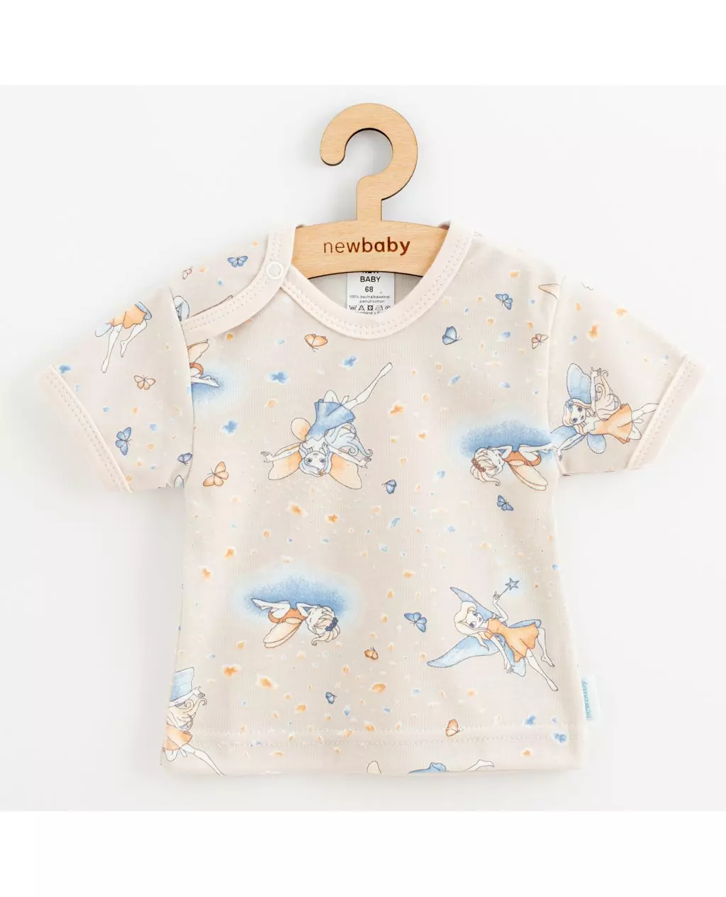 Ontdek het schattige New Baby T-shirt voor je kleintje, maat 68 (4-6 maanden). Dit stijlvolle babyshirt van 100% katoen heeft korte mouwen en is verrijkt met een charmant ontwerp van feeën en vlinders. De praktische drukknoopjes bij de schouder maken aan- en uittrekken eenvoudig.