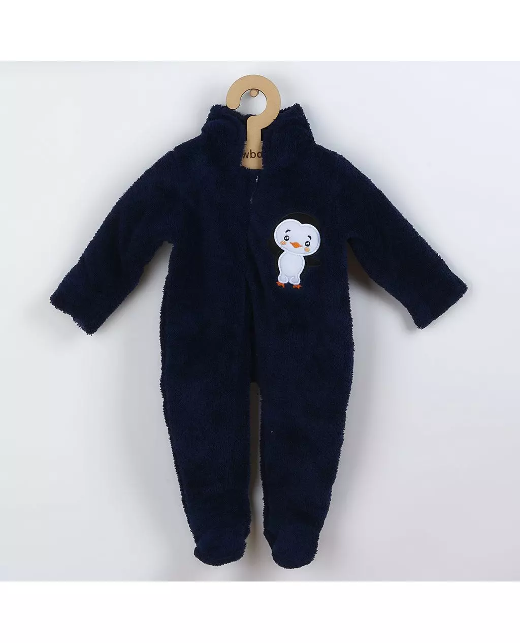 Donkblauwe babypyjama met pinguïnapplicatie in maat 68 (4-6 maanden). Deze warme winterjumpsuit met lange mouwen en capuchon is perfect voor uw baby.