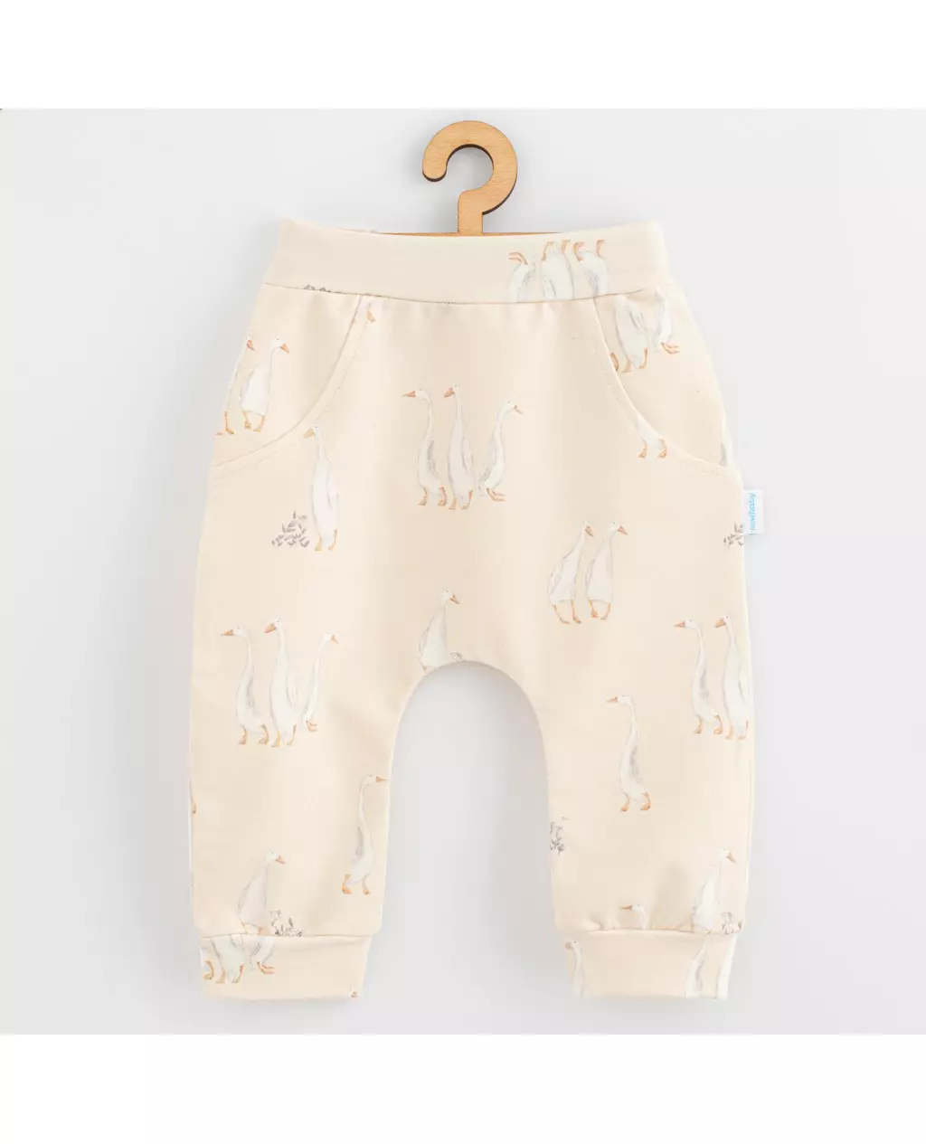Ontdek de New Baby sweatpants in een sfeervolle crèmekleur met een schattig ganzenpatroon. Deze moderne en praktische sweatpants zijn perfect voor kleintjes, gemaakt van 98% katoen en 2% elastaan. De comfortabele, bredere tailleband en broekspijpen zorgen ervoor dat de baby kan bewegen en spelen zonder beperkingen. Deze casual wear is niet alleen een stijlvol alternatief voor traditionele broeken of jeans, maar biedt ook functionaliteit met kleine zakken.