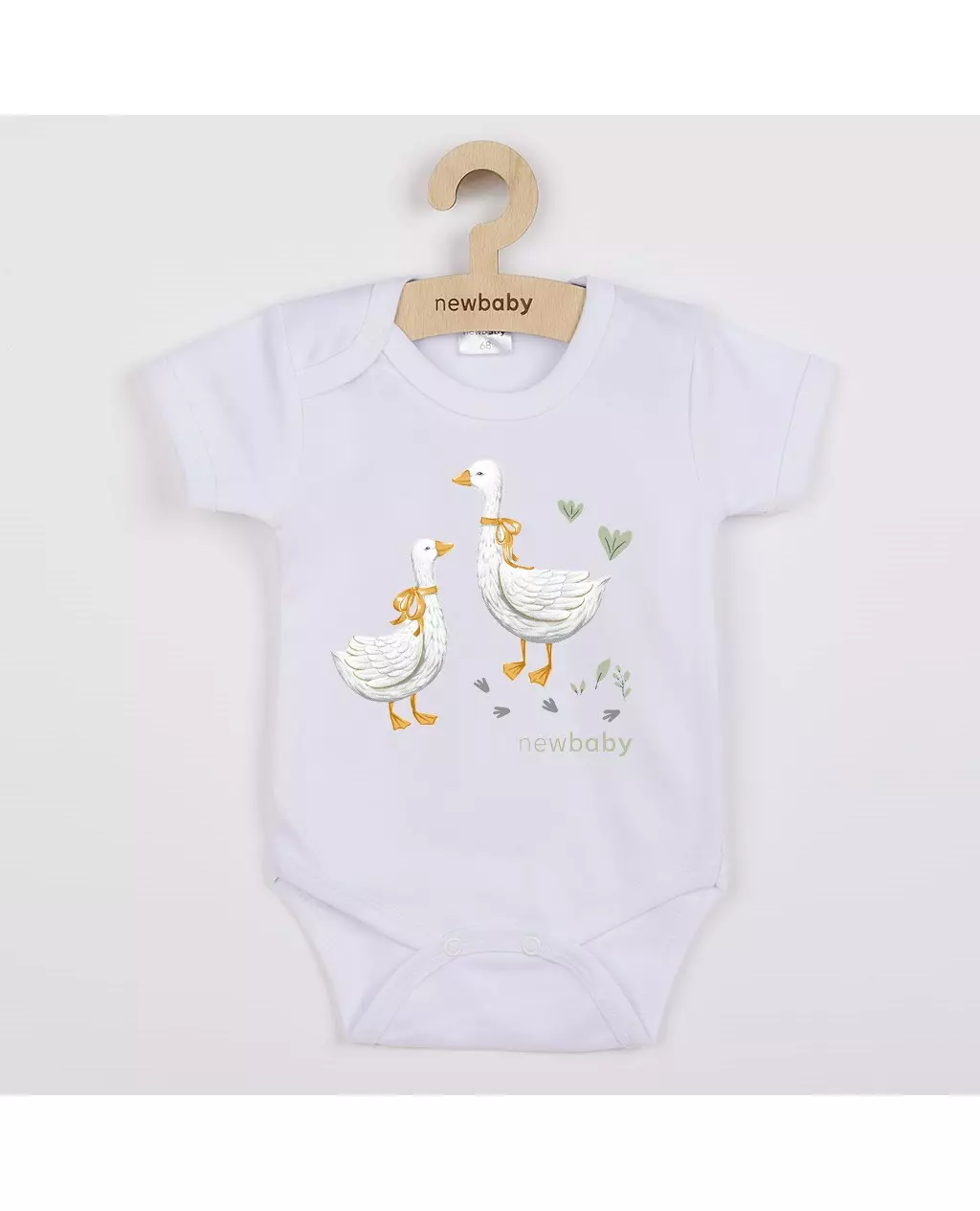 Ontdek de schattige New Baby romper met korte mouwen, vervaardigd uit 100% natuurlijk katoen. Deze baby bodysuit met originele print van leuke ganzen is perfect voor jouw kleintje. Door het gebruik van hypoallergene materialen is deze romper vriendelijk voor gevoelige babyhuidjes en voldoet hij aan de strenge OEKO-TEX STANDARD 100. De praktische drukknoopjes maken aankleden en verschonen gemakkelijk, terwijl de veilige en gecertificeerde kleuren zorgen voor een vrolijke uitstraling.