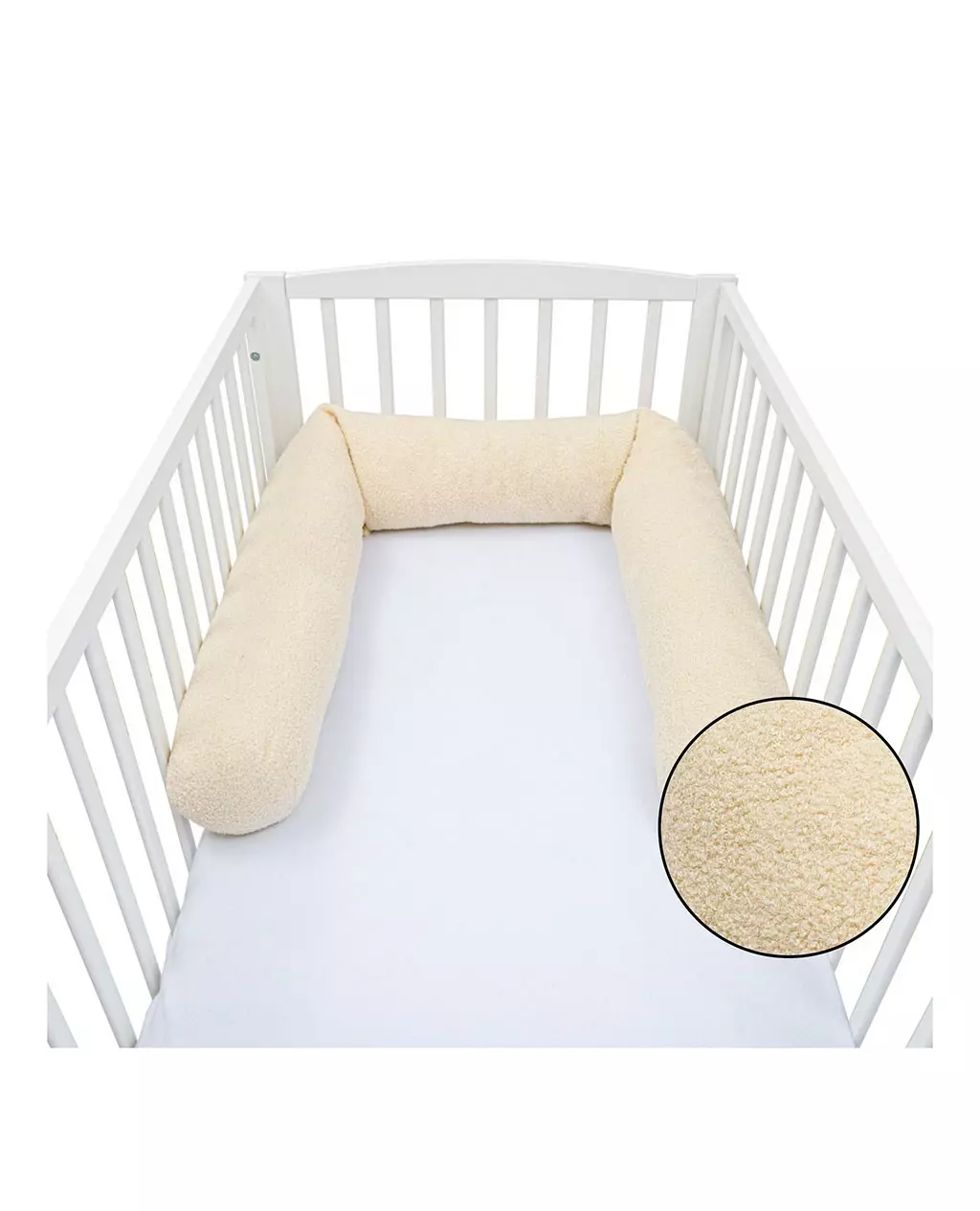 Geef je baby een veilige en knusse slaapomgeving met de New Baby bedomrander uit de Teddy Beige collectie. Deze 3-in-1 mantel functioneert als bedbumper, nestje en kussen in één en combineert comfort, bescherming en stijl. Dankzij de zachte bouclé-stof en het elegante design is deze bedrand niet alleen functioneel, maar ook een charmante toevoeging aan elke babykamer.