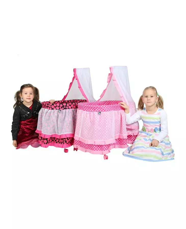 Met de bijgeleverde kap en de kleurrijke bekleding is deze poppenwiegen niet alleen functioneel, maar ook stijlvol. De onderzijde van de wieg is versierd met een extra roze rucherand, wat bijdraagt aan de speelse sfeer. De wieg is lichtgewicht en dankzij de variabele plastic wieltjes eenvoudig te verplaatsen, zodat je het waar je maar wilt kunt neerzetten.