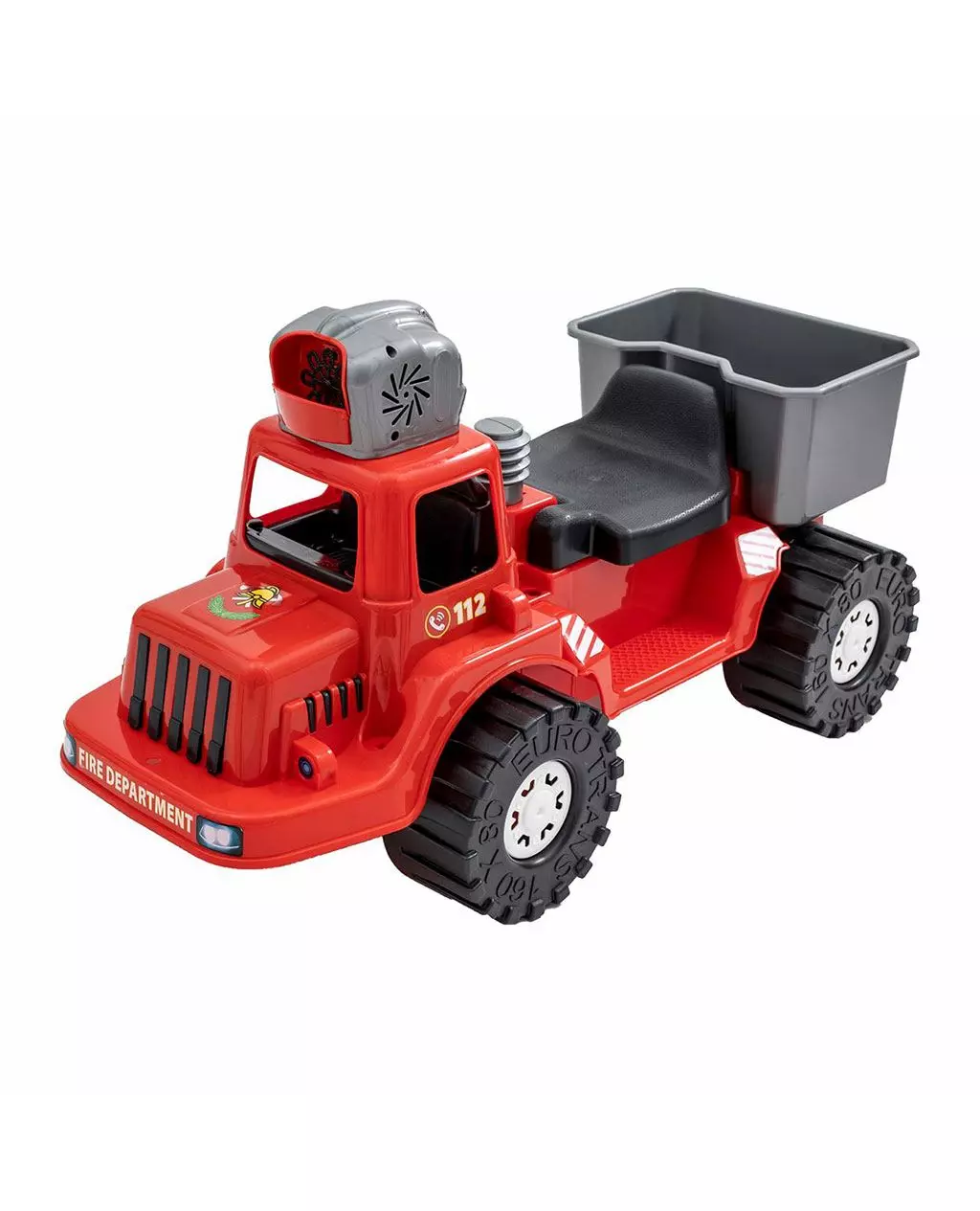Het robuuste ontwerp heeft grote zwarte wielen met witte velgen, een comfortabel zitje en een grijze laadbak aan de achterkant voor het vervoeren van speelgoed. Onder de zitting zit een extra opbergvak. De opvallende rode kleur, het 112-logo en de “FIRE DEPARTMENT”-opdruk maken het voertuig compleet.